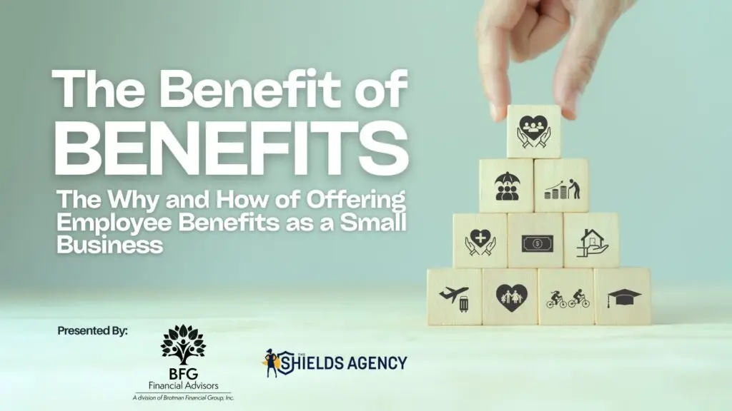 In this practical and insightful webinar, Eric Brotman, CFP® of BFG Financial Advisors and Leslie Shields of The Shields Agency break down the why and how of employee benefits. You’ll learn why benefits are more than just a “perk,” how they can become a powerful tool for recruitment and retention, and what it really takes to create a benefits package that works for both your business and your employees.